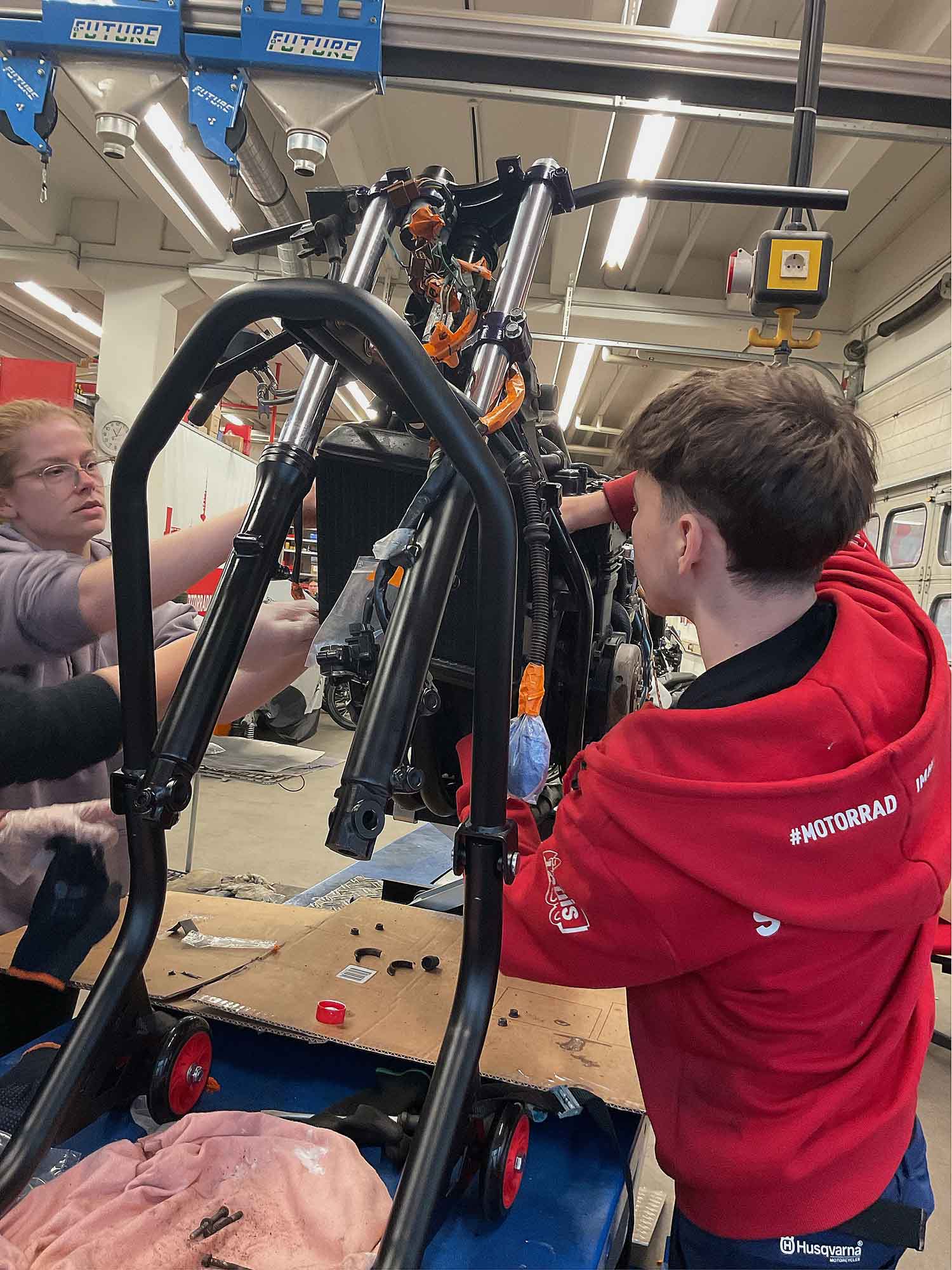 The project involved dust, sparks and precision: lots of sanding, thorough cleaning and intensive derusting. These are all crucial steps to ensure a durable paint finish. Superfluous elements such as the passenger seat and the second silencer were removed to modernise the design and reduce weight. The trainees decided to cut off the entire rear end and replace it with their own design. This process, along with the installation of new springs, turned the bike into a low-slung bobber – an important step in the major transformation of the motorcycle.
