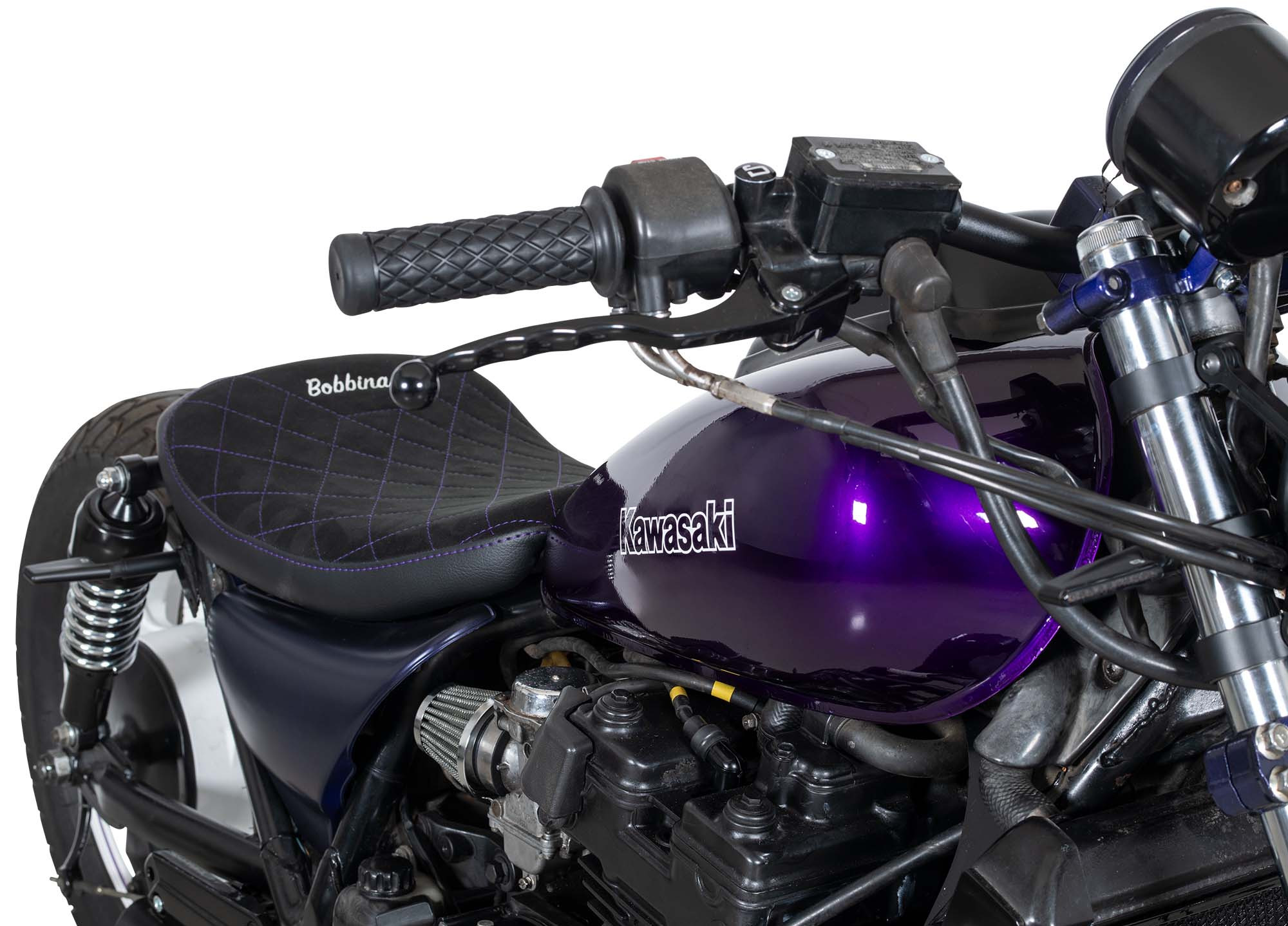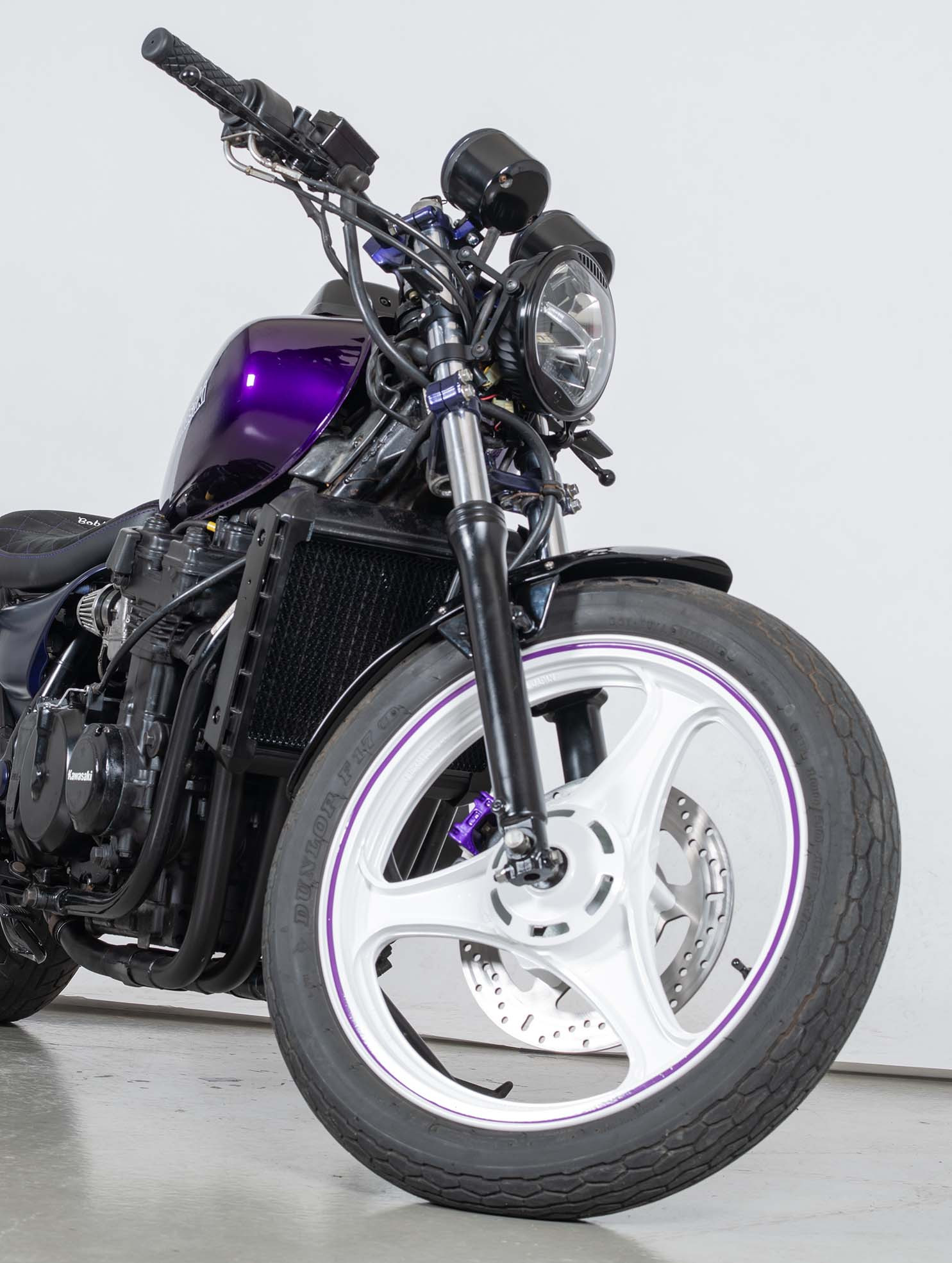 Our trainees opted for a striking shade of purple, for example on the tank and brake calipers, combined with white rims for a modern contrast. Purple decorative stripes and purple stitching on the motorcycle seat added further exciting accents. The result was a blend of modern look and classic retro bobber style – a unique look for a unique motorcycle.