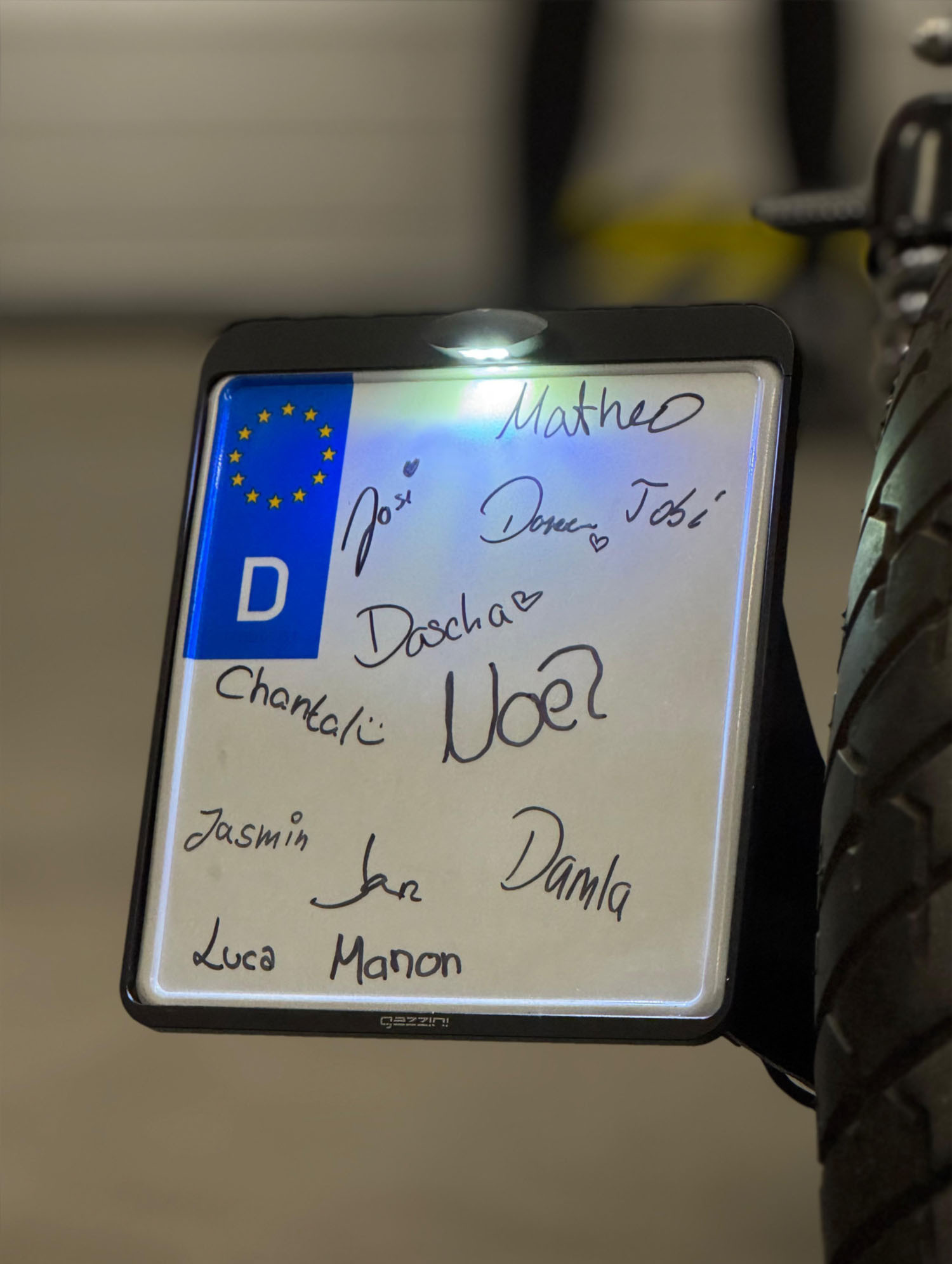 The freshly painted parts were reassembled, cables laid, brackets adjusted and screw connections checked. But despite all the effort, something was still missing. At the same time, the team came up with a homemade design for the motorcycle seat. Three of the trainees visited the upholsterer to cut the upholstery, sew the cover themselves and fit it. The team also thought of a suitable name for the bike. It couldn't remain nameless... The team christened the bike ‘Bobbina’ and embroidered this name onto the motorcycle seat.